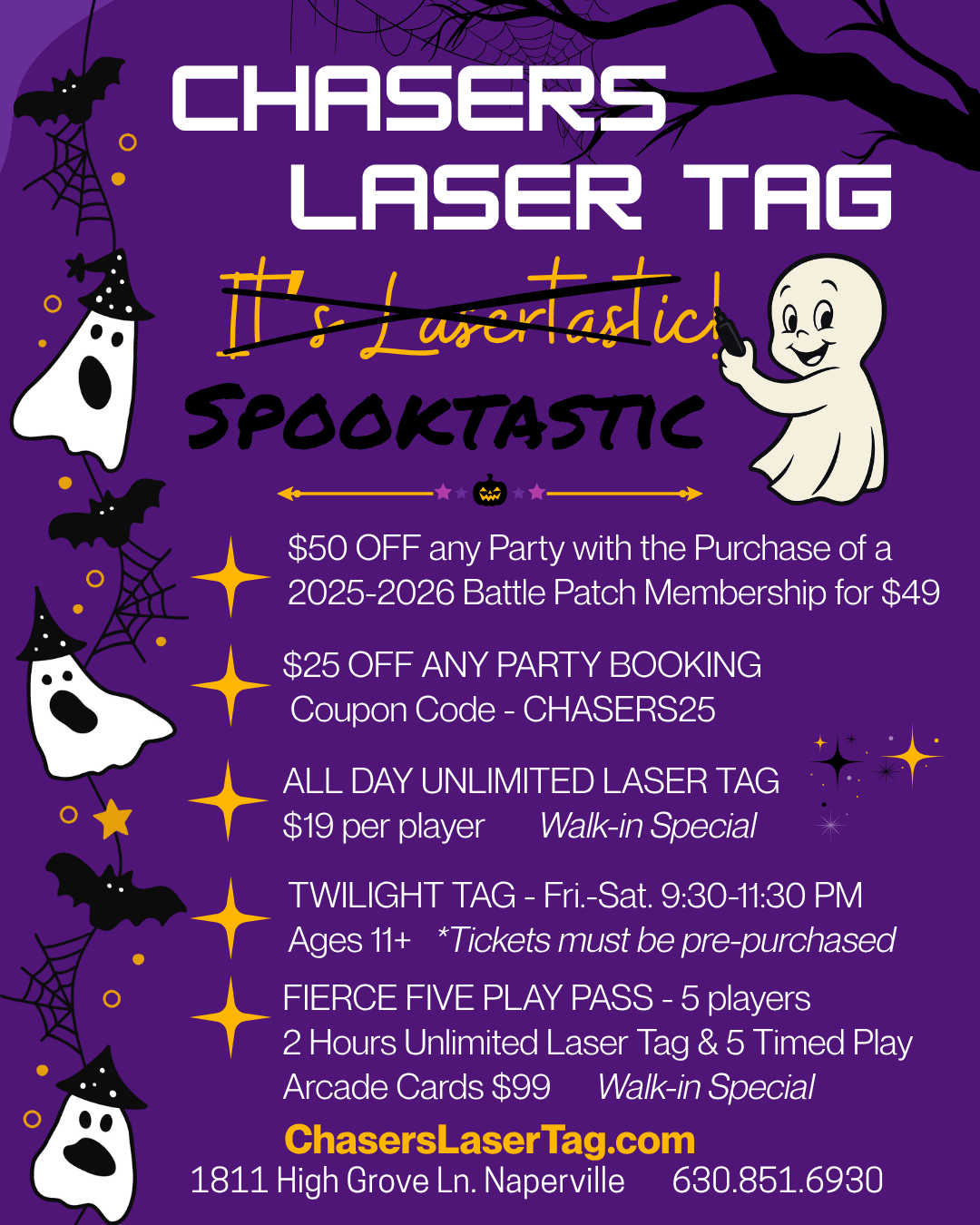$50 off any Chasers Laser Tag or Windy City Mobile Fun party booking ALL YEAR LONG!