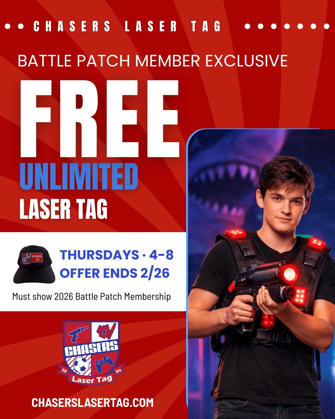 FREE Unlimited Laser Tag tonight from 4-8pm! Bring your Battle Buddies for just $15 each. Not a Battle Patch Member? Purchase your Membership Tonight at Chasers and play FREE Unimited Laser Tag! Start 2026 off with epic fun and EXCLUSIVE savings with Chasers Laser Tag's 2026 Battle Patch Membership for just $49! ChasersLaserTag.com Purchase Your Membership Now at https://www.chaserslasertag.com/battle-patch-membership