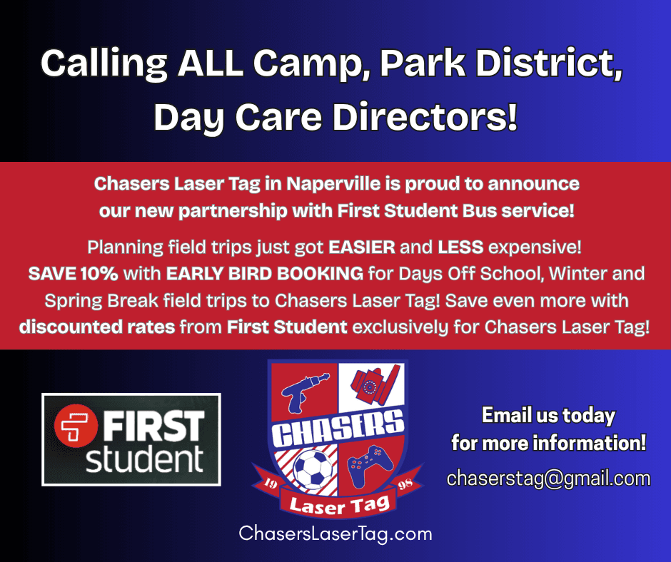 Get 10% off all bookings and the advantage of booking your choice of dates and times during this limited time Early Bird Special! ChasersLaserTag.com #chaserslasertag #naperville #daysoffschool #camps