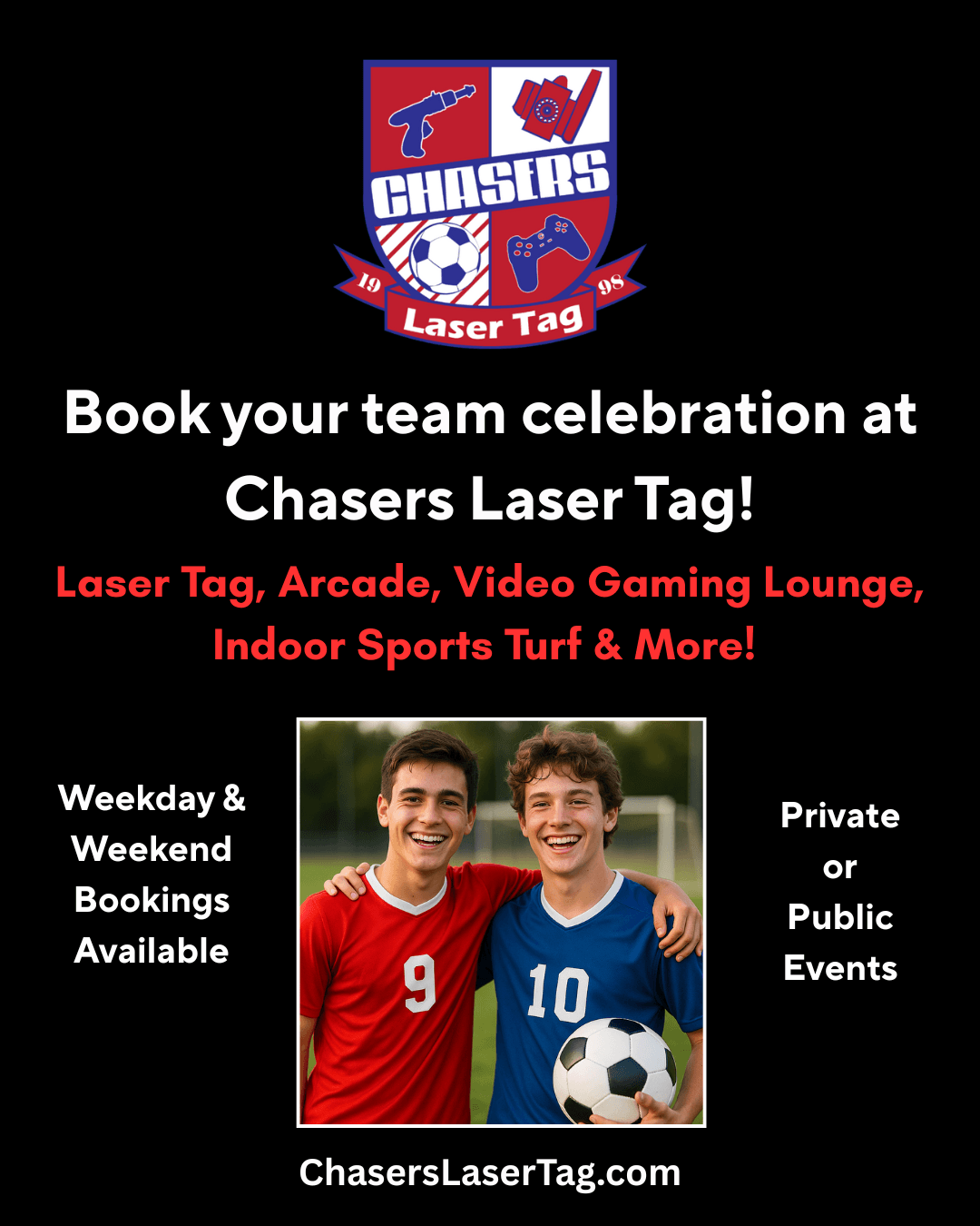 Celebrate like the champs that you are at Chasers Laser Tag! Battle in our 2-level arena, rack up prizes in Chasers Arcade that Pays, and go wild with Bubble Soccer, Nerf Blasters & more. Private + public bookings available!
