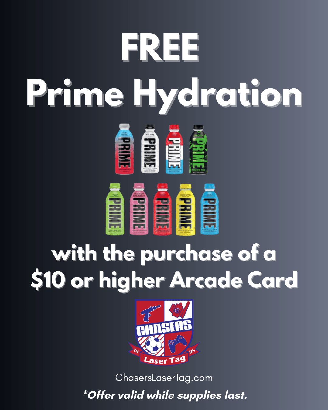 Dive into action at Chasers Laser Tag in Naperville with thrilling laser tag battles and arcade wins! Level up with a FREE Prime Hydration drink when you purchase an Arcade Card of $10 or more. ChasersLaserTag.com #ChasersLaserTag #ChasersTag #Naperville #FREEBIES #PrimeHydration #levelup #weekendplans