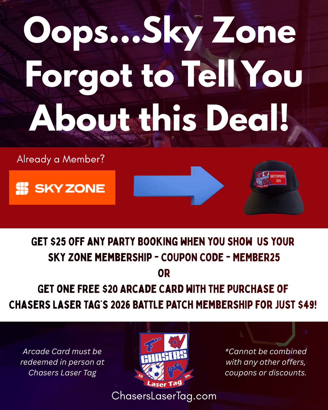 Save BIG when you show us your Sky Zone Membership OR Purchase Chasers 2026 Battle Patch Membership! Limited Time Offer! #ChaseresLaserTag #lasertag #arcade #Naperville #BattlePatchMembership2026 #skyzone ChasersLaserTag.com