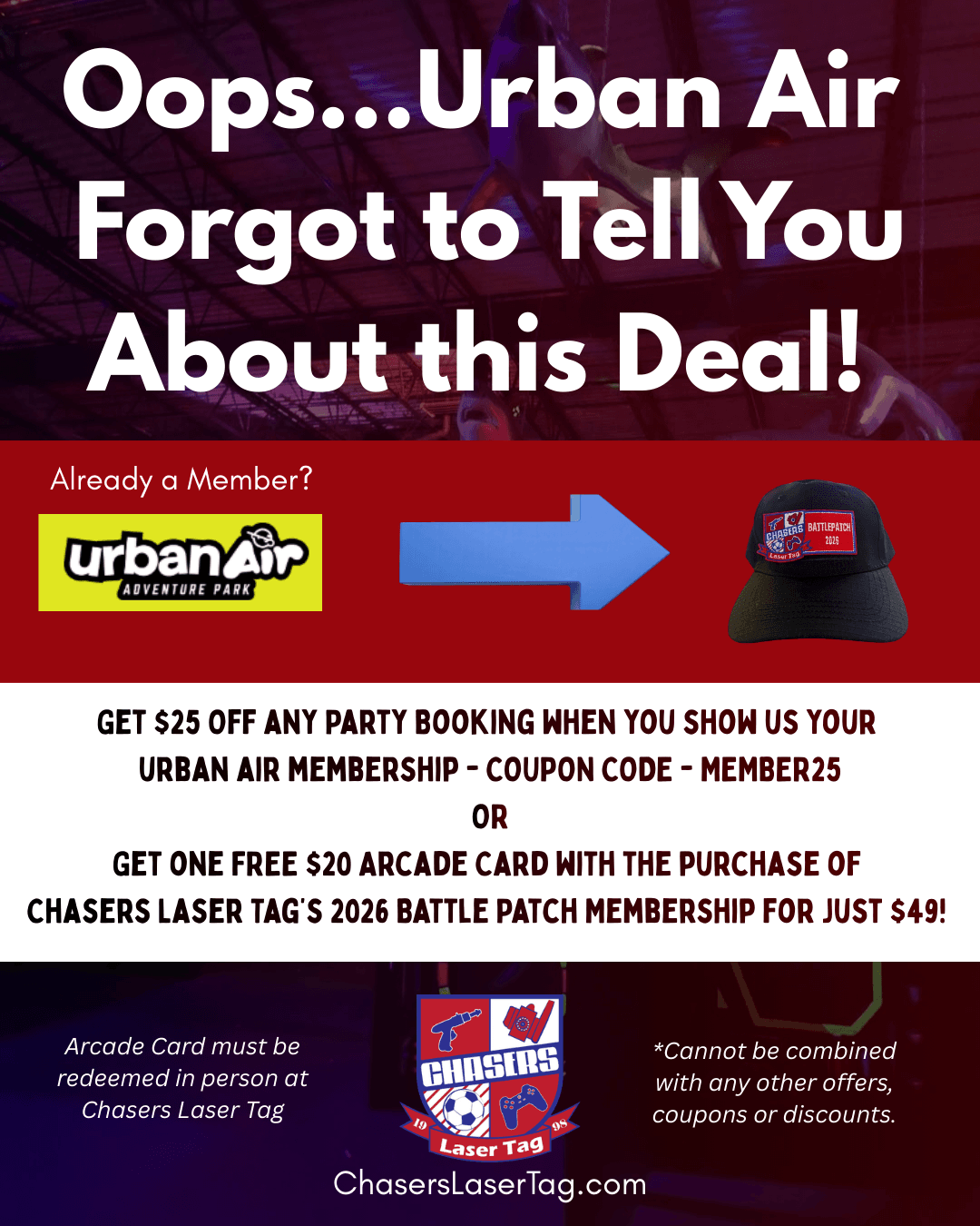 Save BIG when you show us your Urban Air Membership OR Purchase Chasers 2026 Battle Patch Membership! Limited Time Offer! #ChaseresLaserTag #lasertag #arcade #Naperville #BattlePatchMembership2026 #urbanair ChasersLaserTag.com