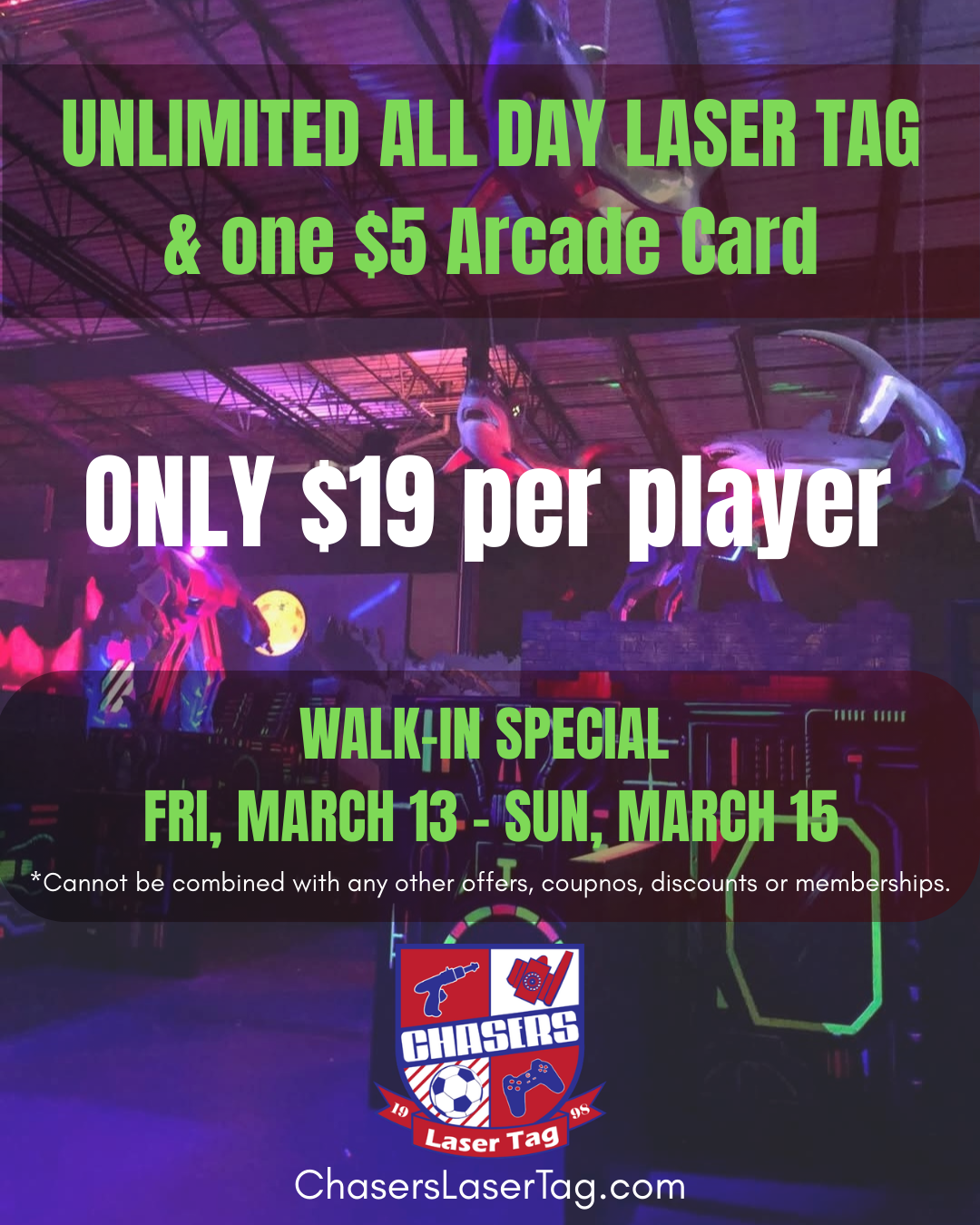 #ChasersLaserTag #SpringBreakFun #LaserTag #NapervilleFun #ArcadeFun #UnlimitedLaserTag #ThingsToDoInNaperville #FamilyFun #WeekendFun #GameOn #NapervilleEvents