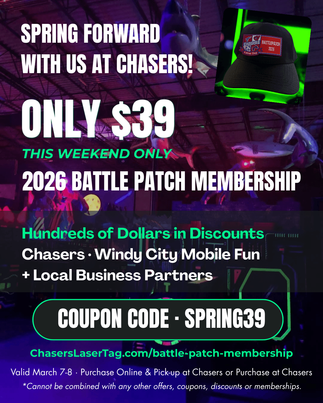 This weekend only, grab a 2026 Battle Patch Membership for JUST $39 and unlock hundreds of dollars in discounts at Chasers Laser Tag, Windy City Mobile Fun, and our local business partners!