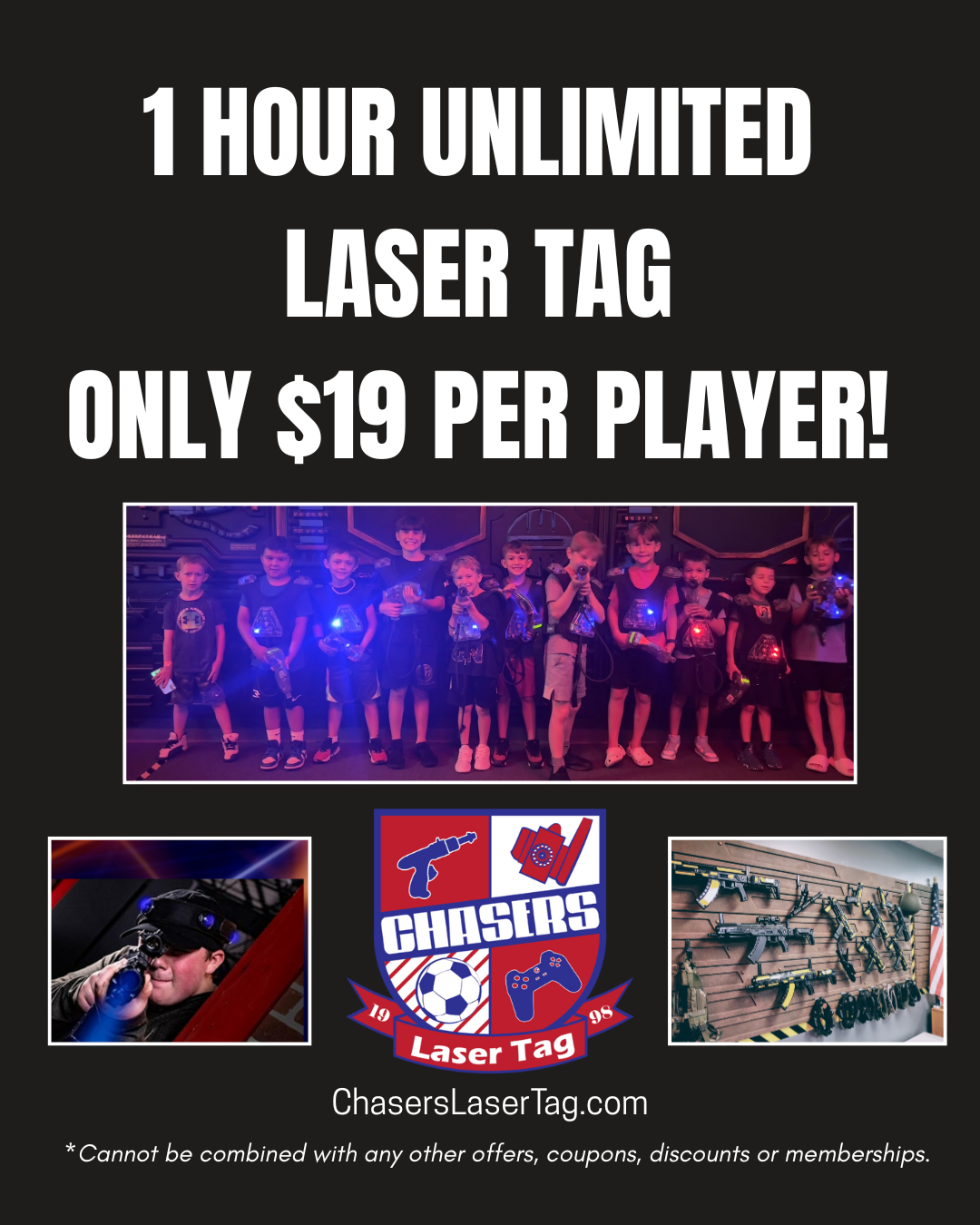 Don't miss out on the fun! Space Marines (Ages 6+) or Combat Tactical Laser Tag (Ages 11+) epic battles wait in our 5,000 sq. ft. 2-level Laser Tag Arena! ChasersLaserTag.com #ChasersLaserTag #Naperville #LaserTag #Arcade #CombatTag