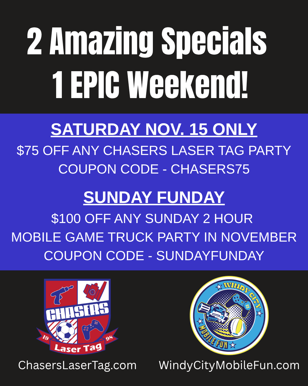 We just leveled your weekend up from a 6️⃣ to a solid 7️⃣ with these epic Chasers Laser Tag and Windy City Mobile Fun deals! 🔫✨ Don’t miss out on the fun — gear up, tag your friends, and make this weekend one to remember!
