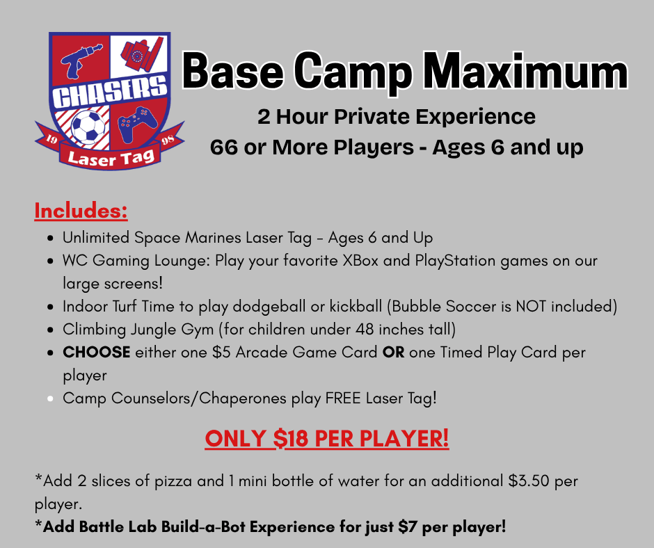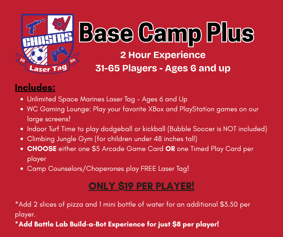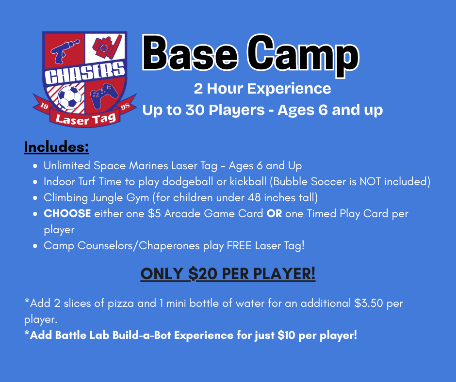 Chasers Laser Tag creates unforgettable and stress-free field trips with our 2-level laser tag arena, unique WC Gaming Lounge, Chasers Arcade that Pays out e-tickets for every game, a versatile Indoor Turf area, Climbing Jungle Gym for children under 48 inches tall and our new Battle Lab Build-a-Bot Experience.