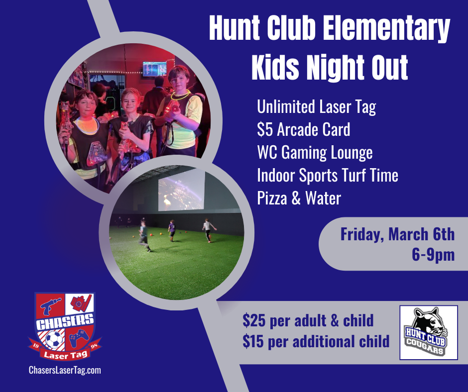 Join us Hunt Club Elementary's Kids Night Out at Chasers Laser Tag! This special event is packed with fun and exciting activites for your school community. From laser tag battles to arcade games and sports turf play, there’s something for every personality and energy level.