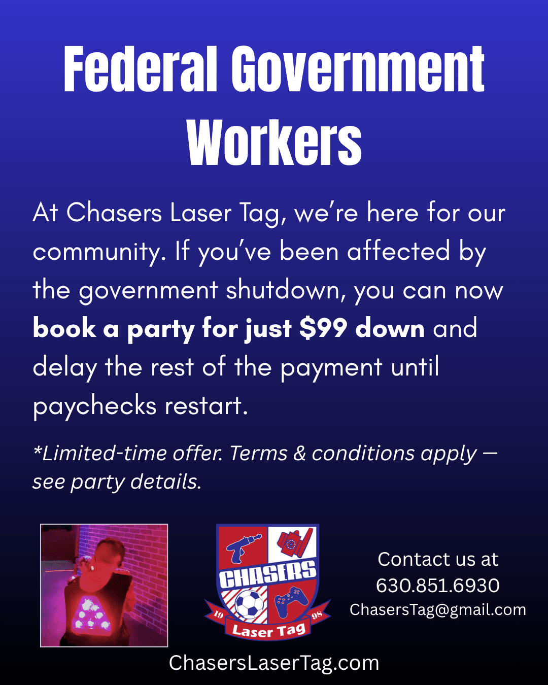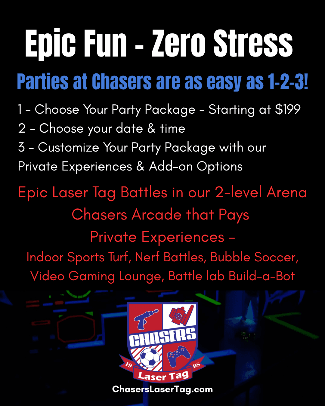 Plan the ULTIMATE party or event today at ChasersLaserTag.com! Limited Time Offer - $25 Off Any Party or Event Booking - Coupon Code: CHASERS25